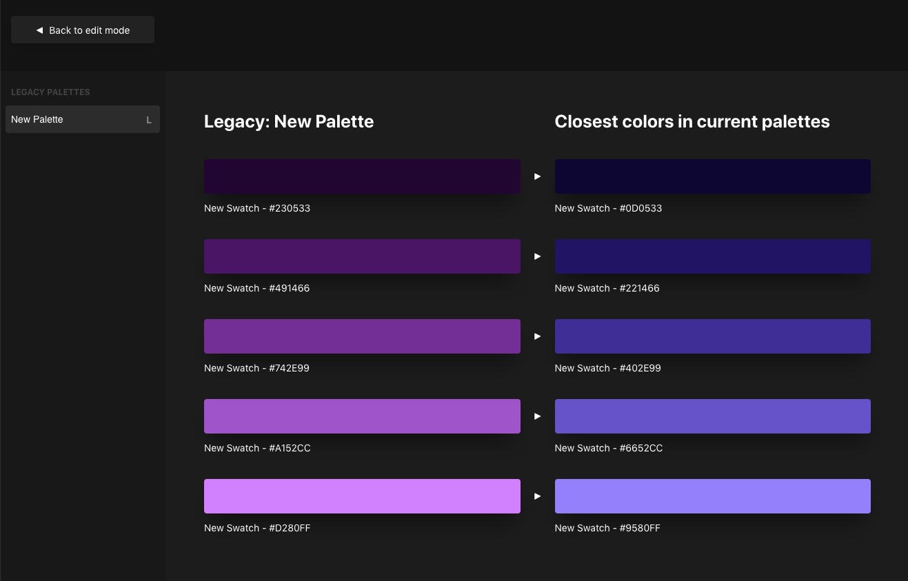 With palettte app, you can import those (legacy) colors and find the most similar colors from your new palettes automatically. You will also immediatly spot when colors are too far off, and you need to introduce more colors in your palettes.