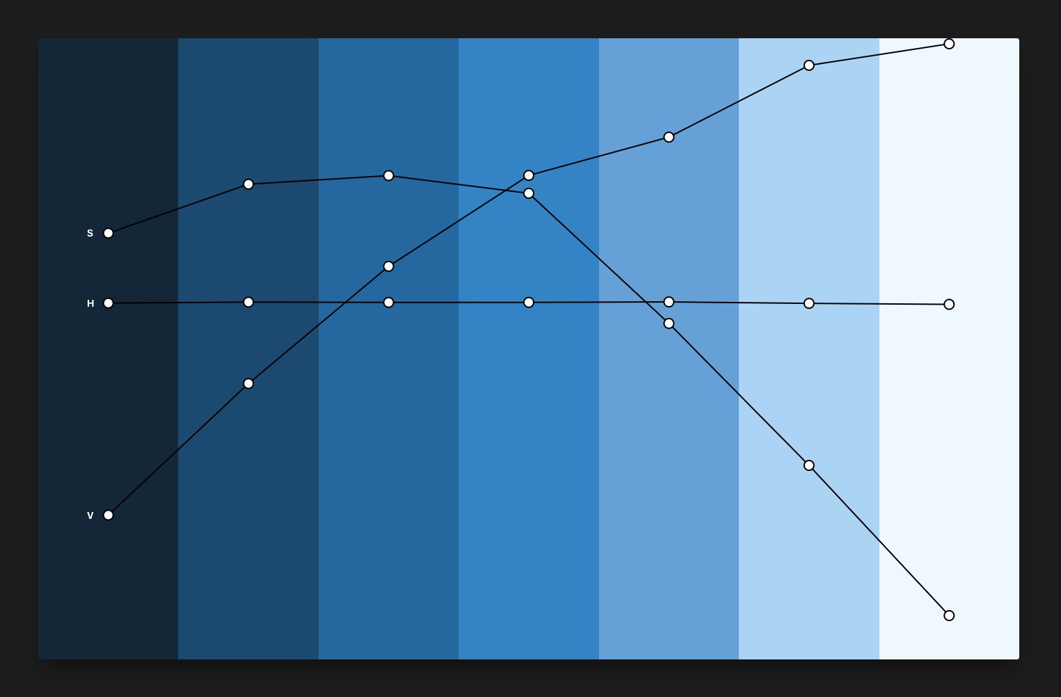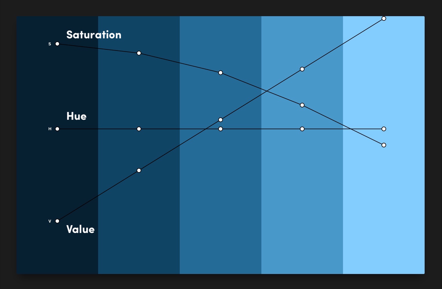 A basic palette for UI Design consists of 8-10 shades where the hue stays the same for all shades, the value goes up and the saturation goes down smoothly as the colors get lighter.