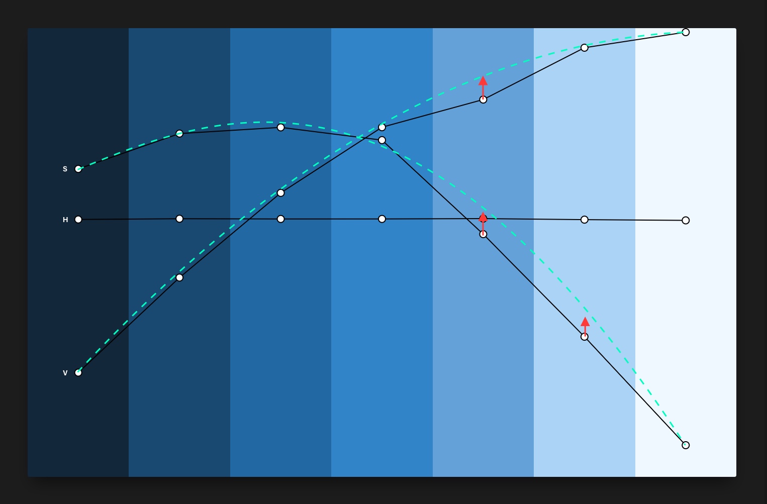 When adding more swatches you can see that three curves form: one for the hue, one for the saturation and one for the value (=brightness) of the colors.